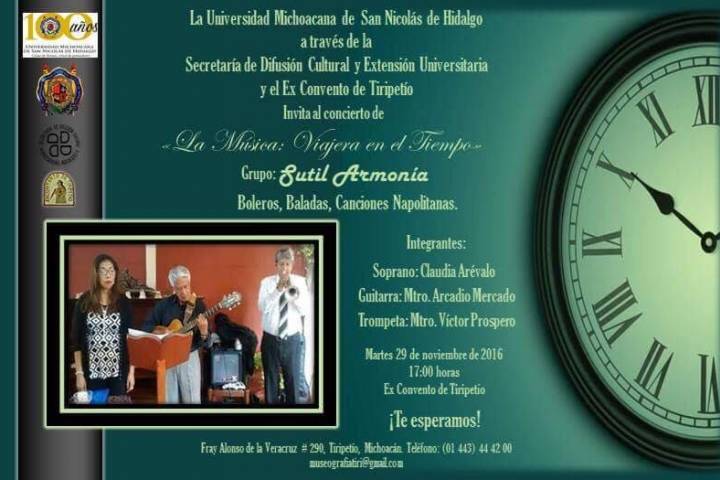 La Secretaría de Difusión Cultural y Extensión Universitaria, a través del Ex Convento de Tiripetío, presentará al grupo Sutil Armonía, conformado por tres músicos michoacanos profesionales, quienes coinciden en su deseo de difundir el arte uniéndose así a las actividades que realiza la Universidad Michoacana de San Nicolás de Hidalgo para vincular la cultura con la sociedad michoacana.