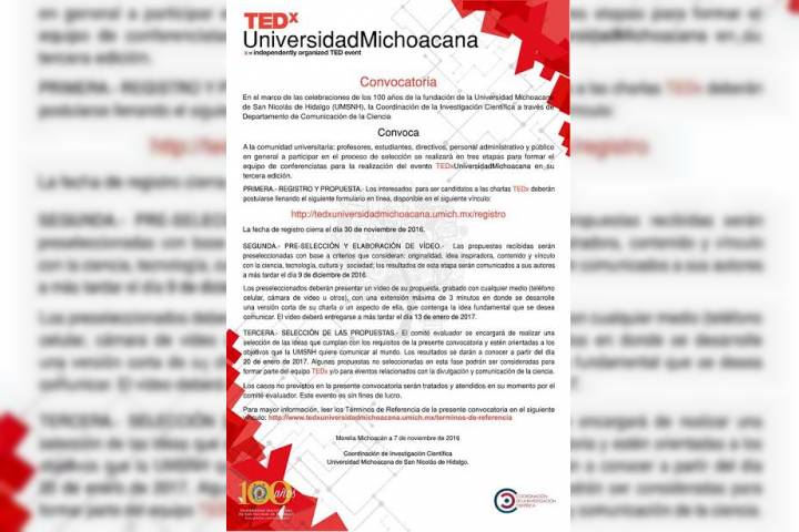 En el marco de las celebraciones por el Centenario de fundación de la Universidad Michoacana de San Nicolás de Hidalgo, la Coordinación de la Investigación Científica, a través del Departamento de Comunicación de la Ciencia, invita a la comunidad universitaria nicolaita, a participar en el proceso de selección del equipo de conferencistas para la tercera edición del evento TEDx Universidad Michoacana.
