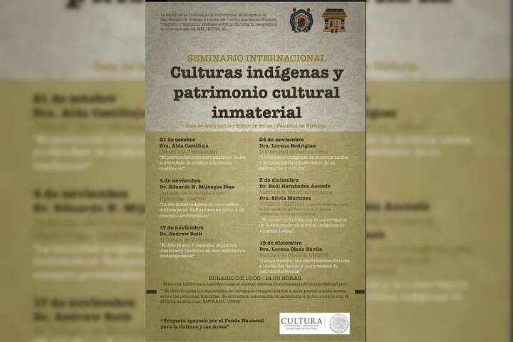 La Universidad Michoacana de San Nicolás de Hidalgo, a través del Cuerpo Académico Espacio Tradición y Memoria: Diálogos entre la Historia, la GeografÃa y la AntropologÃa CA 253 de la Facultad de Historia, invitan a la comunidad universitaria al Seminario Internacional "Culturas indÃgenas y patrimonio cultural inmaterial".