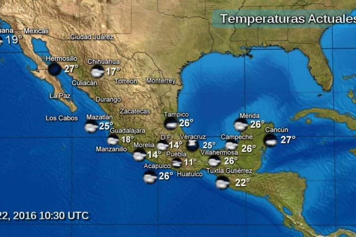 NOTICIAS 22/08/2016Prevalece el clima lluvioso en el paísLa presencia de diversos sistemas en diferentes puntos del país ocasionarán la caída de precipitaciones pluviales en la mayor parte del territorio nacional, señaló el Servicio Meteorológico Nacional (SMN).