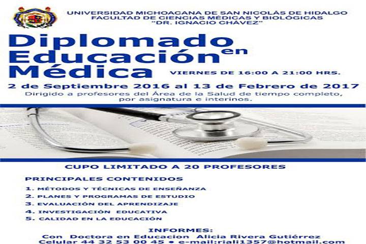 Con el objetivo de apoyar a los profesores en el desempeño de su labor docente de una manera óptima, mediante una actualización en cuanto a las técnicas de enseñanza y planes de estudio, la Facultad de Ciencias Médicas y Biológicas "Dr. Ignacio Chávez" de la Universidad Michoacana de San Nicolás de Hidalgo, invita a los profesores interesados a participar en su próximo Diplomado en Educación Médica.