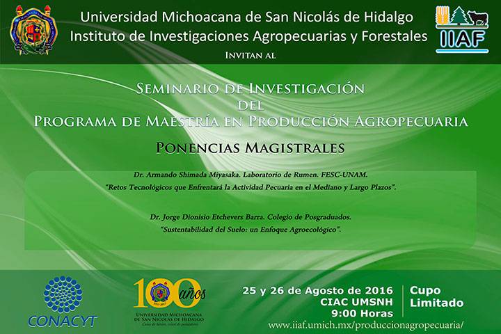 NOTICIAS 23/08/2016En puerta Seminario de Investigación del Programa de Maestría en Producción AgropecuariaComo parte de las actividades del Programa de Maestría en Producción Agropecuaria, el Instituto de Investigaciones Agropecuarias y Forestales de la Universidad Michoacana de San Nicolás de Hidalgo (UMSNH) invita a la comunidad universitaria y público en general a participar en su próximo Seminario de Investigación.