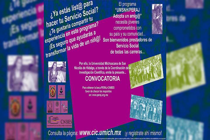 El Programa "UMSNH-Peraj "Adopta un amig@", cumple su séptimo ciclo de trabajo consecutivo en la Universidad Michoacana de San Nicolás de Hidalgo, por lo que aún hay lugares para que los alumnos de licenciatura de esta Casa de Estudios se incorporen al proyecto con el que se beneficia a niños michoacanos en su formación educativa.