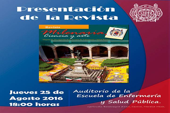 La Universidad Michoacana de San Nicolás de Hidalgo a través de la Escuela de Enfermería y Salud Pública invita a la comunidad universitaria y al público en general, a la presentación del ejemplar número 9 de la revista "Milenaria, ciencia y arte", órgano de divulgación oficial de dicha dependencia universitaria.