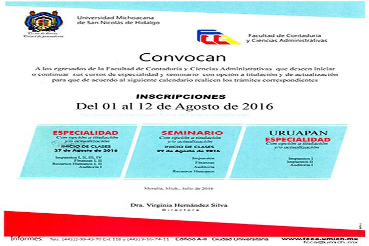 Con el propósito de que los egresados de licenciatura continúen con su preparación académica, lo que les permita integrarse de manera competitiva al mundo laboral, la Facultad de Contaduría y Ciencias Administrativas de la Universidad Michoacana de San Nicolás de Hidalgo (UMSNH), invita a sus egresados a ingresar a los cursos de Especialidad y Seminarios de actualización con opción a titulación.