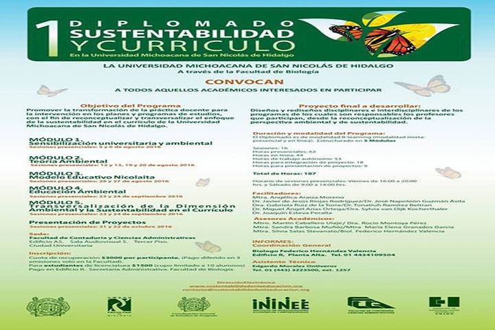 Como resultado del trabajo de colaboración por parte de la Facultad de Biología, la Coordinación General de Estudios de Posgrado, la Facultad de Contaduría y Ciencias Administrativas, el Instituto de Investigaciones sobre los Recursos Naturales, el Instituto de Investigaciones Económicas y Empresariales y el Instituto de Investigaciones Históricas, dio inicio el Diplomado "Sustentabilidad y Currículo en la UMSNH"