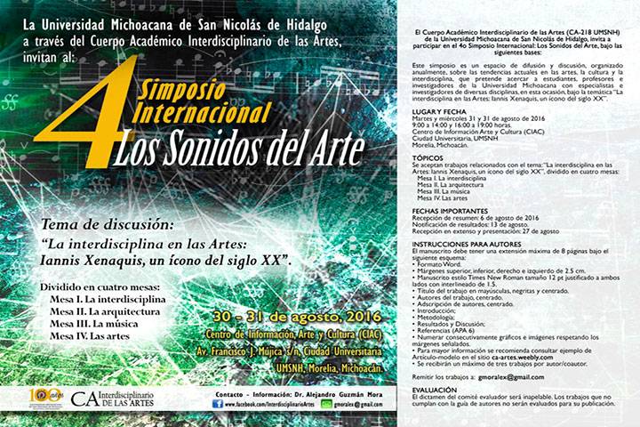 Como un espacio de difusión y discusión, que se organiza anualmente, sobre las tendencias actuales en las artes, la cultura y la interdisciplina, el Cuerpo Académico Interdisciplinario de las Artes (CA-2018 UMSNH), de la Universidad Michoacana de San Nicolás de Hidalgo (UMSNH), invita a los interesados a participar en el Cuarto Simposio Internacional: Los Sonidos del Arte.