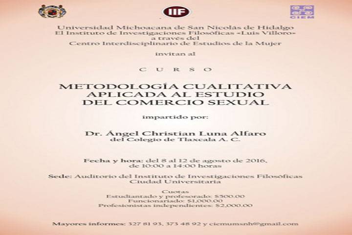 Dado que el comercio sexual es un fenómeno que ha estado presente a lo largo de la historia, conocido como el oficio más antiguo del mundo, el Instituto de Investigaciones Filosóficas "Luís Villoro", a través del Centro Interdisciplinario de Estudios de la Mujer, invita a estudiantes, profesores, así como profesionistas independientes interesados en el tema, a asistir al próximo curso "Metodología cualitativa aplicada al estudio del Com... Ver más...