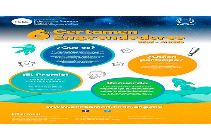 Continúa abierto el proceso de registro para los interesados en participar en el Sexto Certamen Emprendedores FESE-ANUIES 2016 que organiza de manera conjunta la Fundación Educación Superior-Empresa, A.C. (FESE) y la Asociación Nacional de Universidades e Instituciones de Educación Superior (ANUIES).
