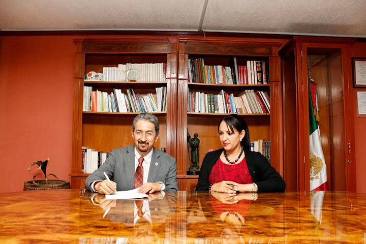 El rector de la Casa de Hidalgo, Medardo Serna González, y la directora del Institu... Ver más...