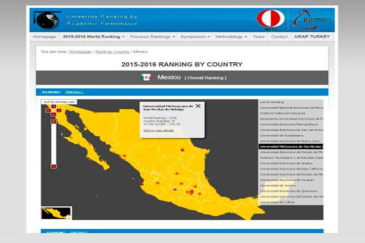 NOTICIAS 06/07/2016Octavo lugar nacional para la UMSNH por la calidad de su investigaciónLa organización internacional Ranking Universitario por Desempeño Académico cuyas siglas en inglés son URAP (University Ranking by Academic Performance), ubica a la Universidad Michoacana de San Nicolás de Hidalgo en el octavo lugar, entre las universidades mexicanas, en base a las publicaciones científicas, citas e impacto de la investigación realizada en la Casa de Estudios.