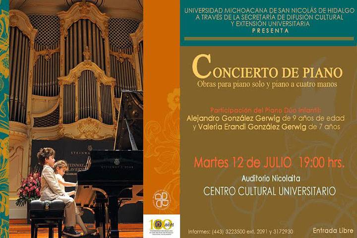 Alejandro y Valeria González Gerwig, de 9 y 7 años de edad, se presentarán en concierto de piano la próxima semana en el Centro Cultural Universitario, anunció la Secretaría de Difusión Cultural y Extensión Universitaria de la Casa de Hidalgo.