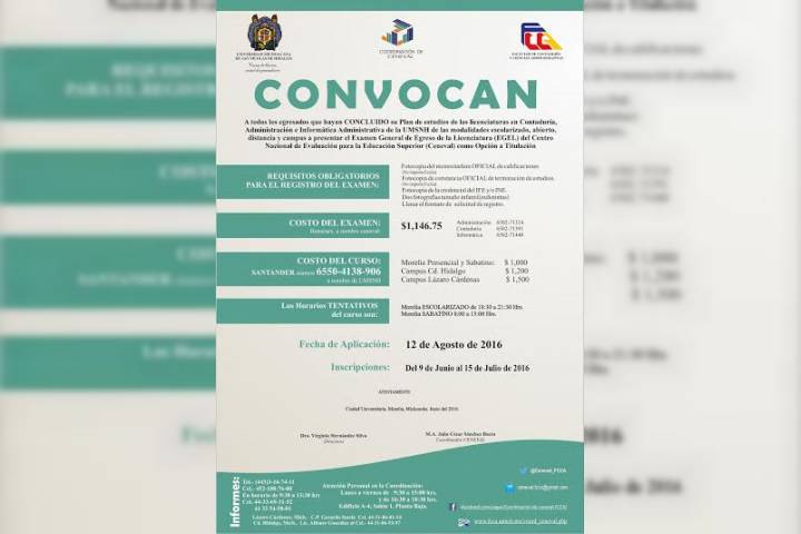 La Facultad de Contaduría y Ciencias Administrativas de la Universidad Michoacana de San Nicolás de Hidalgo (UMSNH), convoca a los egresados que hayan concluido su plan de estudios de las Licenciaturas en Contaduría, Administración e Informática Administrativa, a presentar el Examen General de Egreso de Licenciatura (EGEL) del Centro Nacional de Evaluación para la Educación Superior (Ceneval), como opción de titulación.