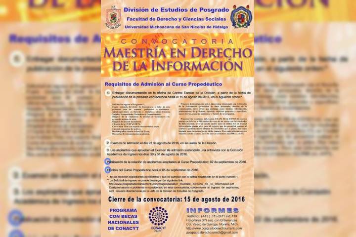 Como parte de los posgrados de calidad, reconocidos por el Consejo Nacional de Ciencia y Tecnología (Conacyt), la Facultad de Derecho y Ciencias Sociales de la Casa de Hidalgo lanzó la convocatoria para el ingreso a la Maestría en Derecho de la Información.
