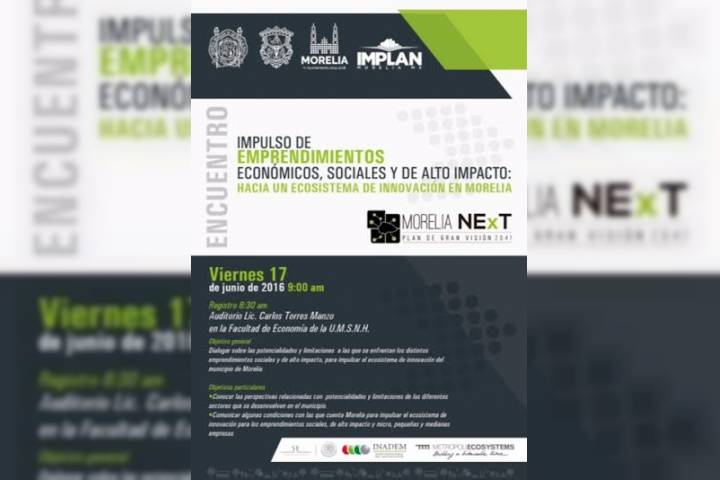 NOTICIAS 16/06/2016Organiza UMSNH foro para emprendedores e innovadores morelianosCon la finalidad de impulsar el desarrollo empresarial en sector joven de la población moreliana, la Universidad Michoacana de San Nicolás de Hidalgo junto con el Ayuntamiento de Morelia, a través del Instituto Municipal de Planeación de Morelia, llevará a cabo en su Facultad de Economía, el encuentro "Impuso de emprendimientos económicos y sociales de alto impacto: hacia un ecosistema de innovación en Morelia".