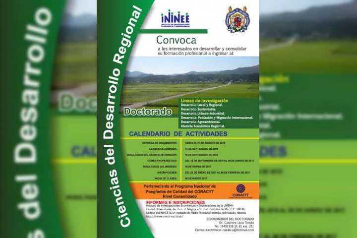 NOTICIAS 06/06/2016UMSNH abre convocatoria doctorado en ciencias de Desarrollo RegionalEl Instituto de Investigaciones Económicas y Empresariales (ININEE) de la Universidad Michoacana de San Nicolás de Hidalgo abrió su proceso de inscripción para ingresar al Doctorado en Ciencias del Desarrollo Regional, programa dirigido a quienes cuentan con el grado de maestría en ciencias económicas, administrativas o sociales entre ellas: Economía, Administración, Historia, Desarrollo Regional, Desarrollo Rural, Problemas Agropecuarios... Ver más...