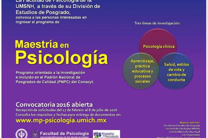 NOTICIAS 08/06/2016Maestría en Psicología Educativa, de la Salud y Clínica, en proceso de admisiónLa Universidad Michoacana de San Nicolás de Hidalgo, a través de la Facultad de Psicología, comprometida con la formación de recursos humanos altamente calificados para desarrollar y aplicar conocimientos en la solución de problemas individuales y sociales, ofrece el programa de Maestría en Psicología.