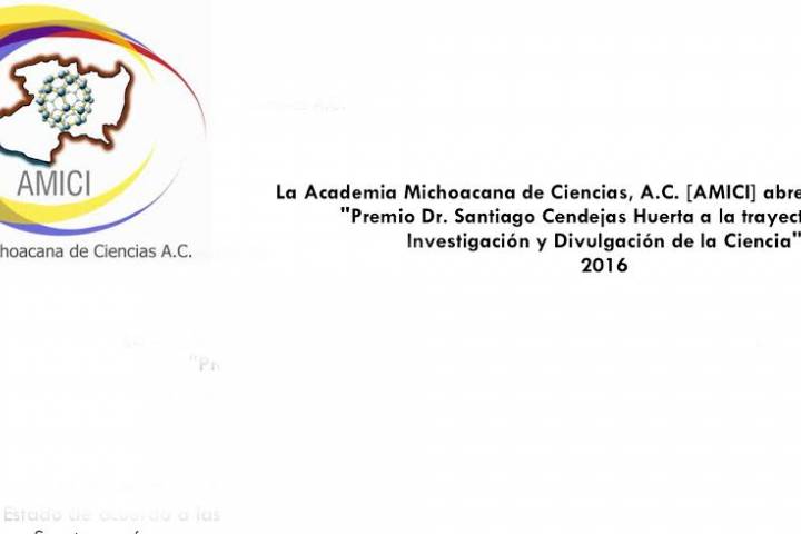 NOTICIAS 09/06/2016Abierta convocatoria para aspirantes al Premio Dr. Santiago Cendejas HuertaLa Academia Michoacana de Ciencias, A.C. (AMICI) abrió la convocatoria para el registro de los aspirantes al Premio "Dr. Santiago Cendejas Huerta" para su edición 2016, quien fuera pionero de la Universidad Michoacana de San Nicolás de Hidalgo y formador de muchas generaciones nicolaitas.