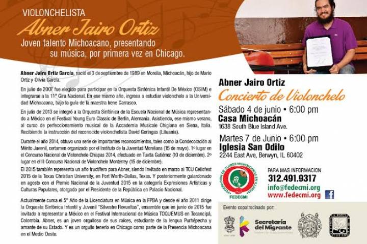 A invitación de la Federación de Clubes Michoacanos en Illinois (FEDECMI), el joven violochelista mi... Ver más...