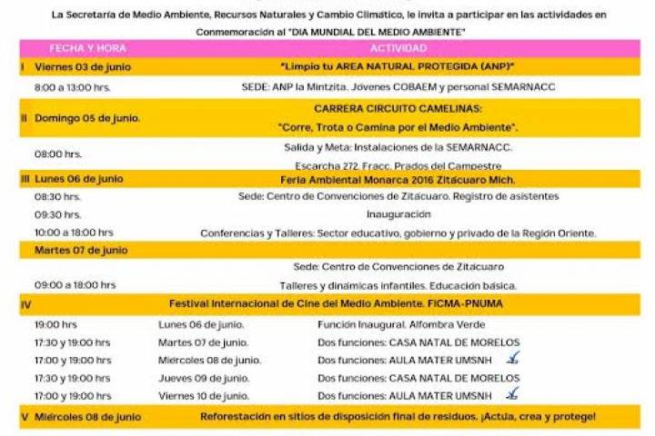 NOTICIAS 01/06/2016UMSNH participa en la 3ª Semana Estatal del Medio AmbienteLa Universidad Michoacana de San Nicolás de Hidalgo, en conjunto con la SecretarÃa del Medio Ambiente, Recursos Naturales y Cambio Climático (Semarnacc), ProcuradurÃa Federal de Protección al Ambiente (Profepa) y la SecretarÃa de Innovación y Desarrollo Tecnológico del Estado, llevará a cabo una serie de conferencias, talleres, jornadas de reforestación y actividades deportivas, con motivo del DÃa Mundial del Medio Ambiente a celebrars... Ver más...