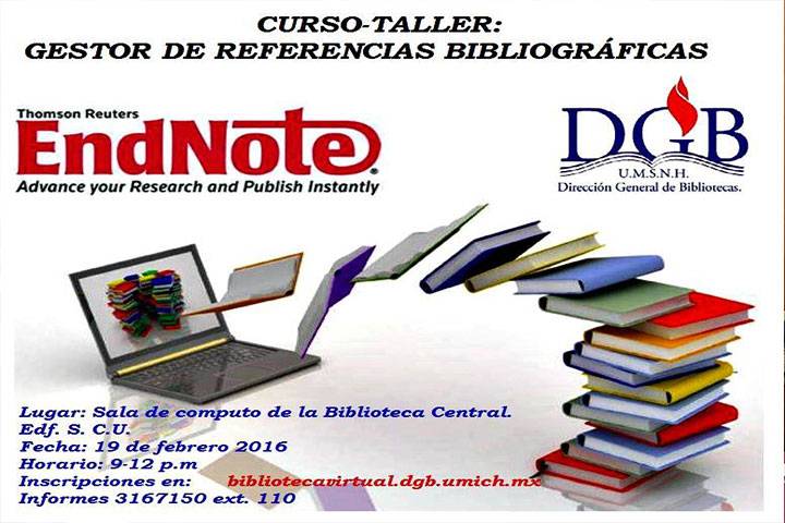 Con el objetivo de organizar de una manera práctica y funcional las referencias bibliográficas, así como aplicar distintos estilos de citación a un documento, la Dirección General de Bibliotecas de la Universidad Michoacana de San Nicolás de Hidalgo, a través de su Biblioteca Virtual, llevará a cabo la próxima semana el Curso-Taller Gestión de Referencias Bibliográficas.