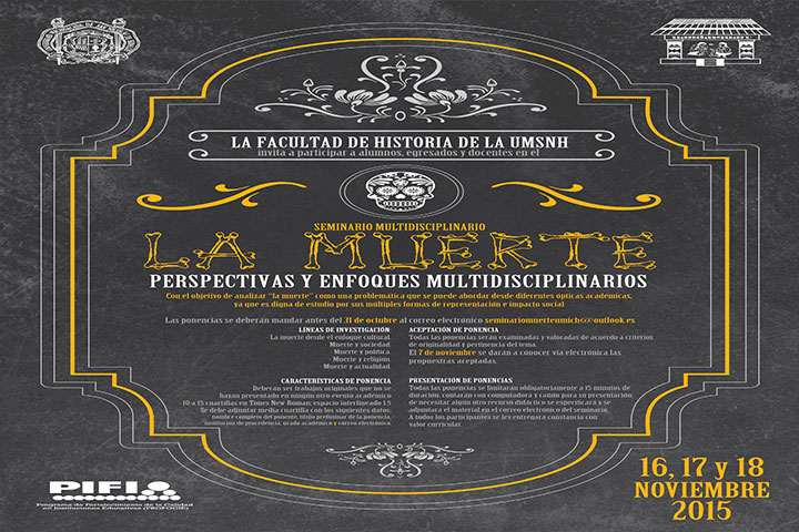 Con motivo del ritual tradicional que se lleva a cabo en nuestro país durante los días 1 y 2 de noviembre para recordar a los muertos, la Facultad de Historia de la Universidad Michoacana de San Nicolás de Hidalgo llevará a cabo del 16 al 18 de noviembre próximos el seminario titulado, "La Muerte, Perspectivas y Enfoques Multidisciplinarios", en el que podrán participar con sus ponencias tanto alumnos como egresados y docentes.