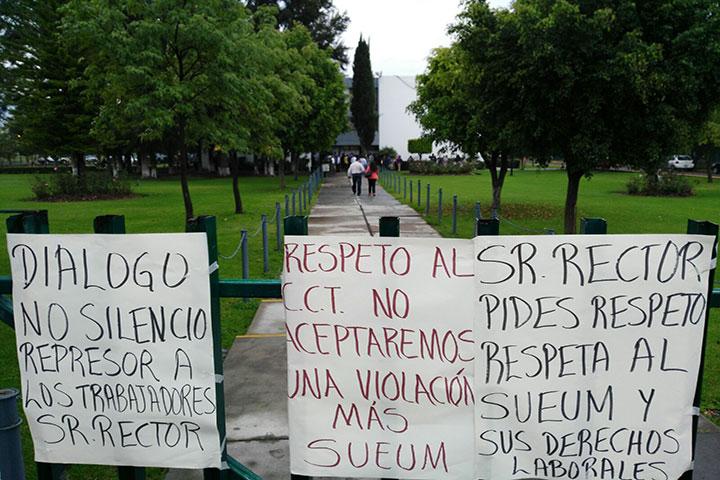 Desde muy temprana hora agremiados al Sindicato Único de Empleados de la Universidad Michoacana (SUEUM) decidieron bloquear la entrada del edificio de rectorÃa y colocaron diversas cartulinas con leyendas en contra del rector Medardo Serna González.