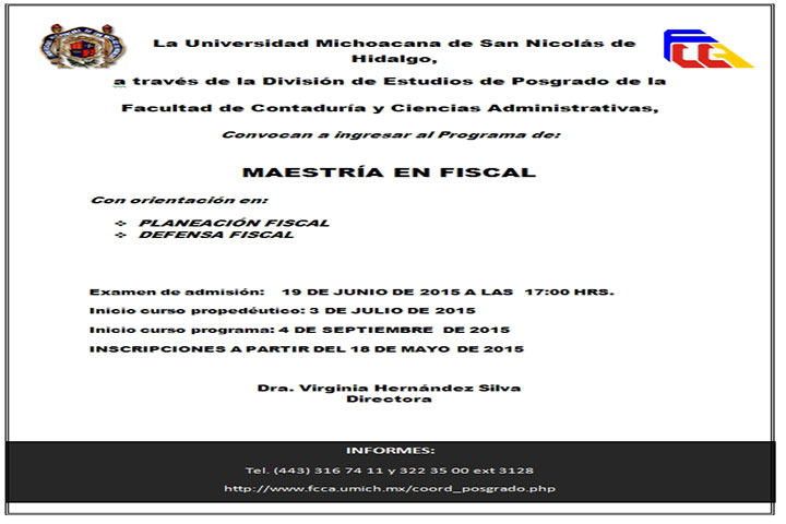 La Universidad Michoacana de San Nicolás de Hidalgo, a través de la División de Estudios de Posgrado de la Facultad de Contaduría y Ciencias Administrativas, convoca a ingresar al Programa de Maestría en Fiscal con orientación en Planeación Fiscal y Defensa Fiscal bajo un modelo que permite a los estudiantes cuando egresan estar en condiciones de competir exitosamente en los mercados laboral de los ámbitos público y privado.