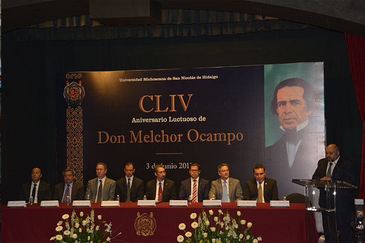 Los ideales y las acciones progresistas de hombres como Melchor Ocampo deben ser modelos de conducta y no soporte de mitos, afirmó el director de la Facultad de Letras, Juan Carlos González Vidal, durante la ceremonia conmemorativa del CLIV Aniversario Luctuoso de Melchor Ocampo, llevada a cabo en el Aula Mater del Colegio Primitivo y Nacional de San Nicolás de Hidalgo.