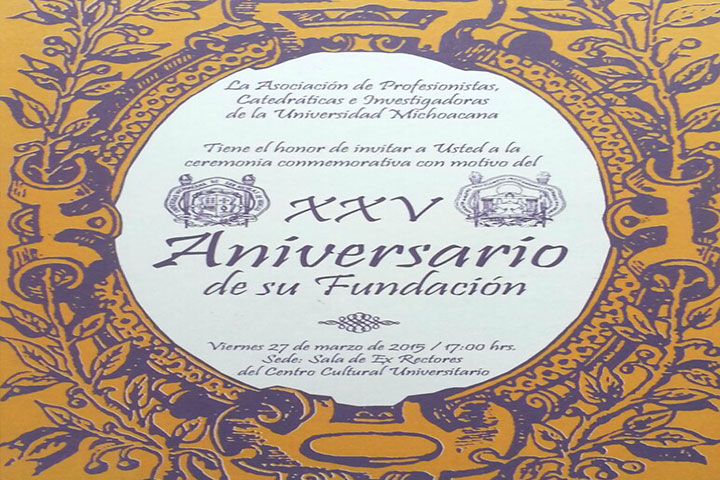 La Asociación de Profesionistas, Catedráticas e Investigadoras de la Universidad Michoacana de San Nicolás de Hidalgo (APCIUM), conmemora 25 años de su fundación y lo celebrará con una ceremonia académico-cultural en el Centro Cultural Universitario (CCU).