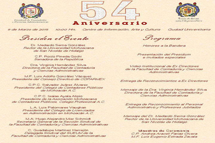 Pilar indiscutible de la construcción y desarrollo de Michoacán durante más de medio siglo, la comunidad nicolaita festejará el 54 aniversario de fundación de la Facultad de ContadurÃa y Ciencias Administrativas de la Universidad Michoacana de San Nicolás de Hidalgo, una institución que ha generado hombres y mujeres de bien, ocupados en colaborar en las tareas para detonar el progreso de la entidad.
