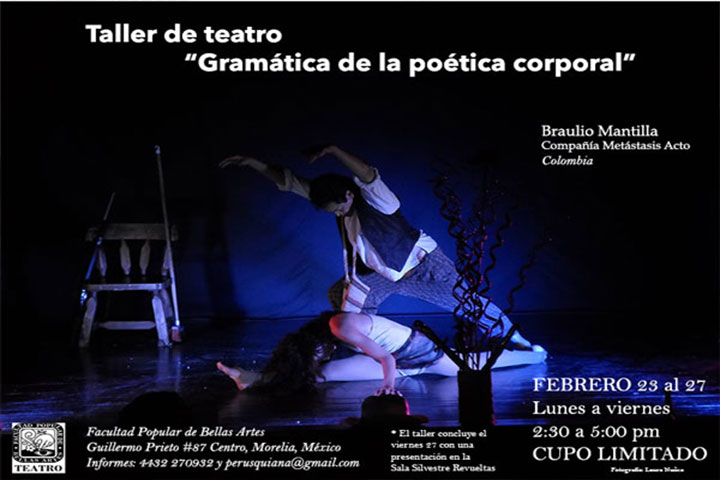 NOTICIAS 22/02/2015El artista colombiano Braulio Mantilla, impartirá curso en Bellas Artes Con la finalidad de hacer aflorar el talento de las alumnas de Teatro en la Facultad Popular de Bellas Artes (FPBA) de la Universidad Michoacana de San Nicolás de Hidalgo (UMSNH), este lunes 23 inicia el taller Gramática de la poética corporal femenina, impartido por el maestro colombiano en Ártes Escénicas, Braulio Mantilla Meza.