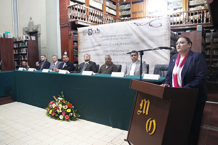 "A 85 años de su fundación se encuentra en este edificio una parte medular de la esencia del espíritu de nuestra universidad", aseveró el Secretario General de la Universidad Michoacana de San Nicolás de Hidalgo, Alejo Maldonado Gallardo en representación del Rector José Gerardo Tinoco Ruiz en el LXXXV Aniversario de la Biblioteca Pública Universitaria.