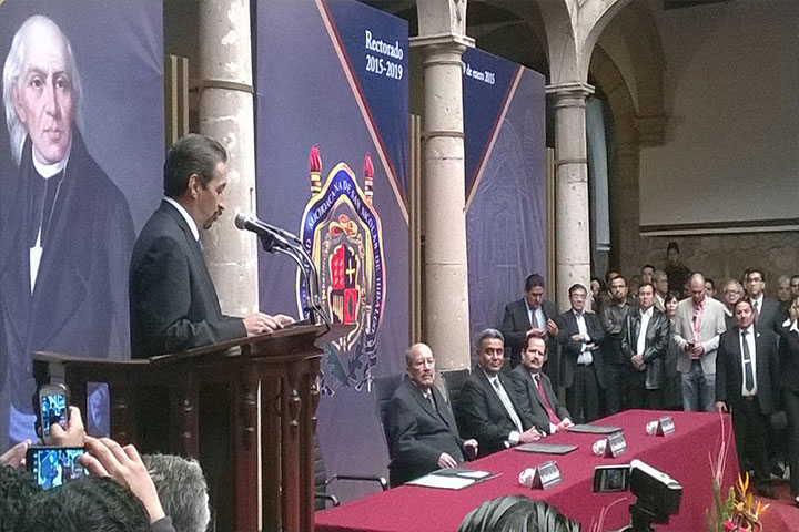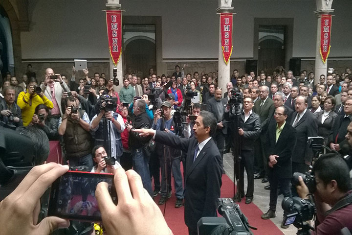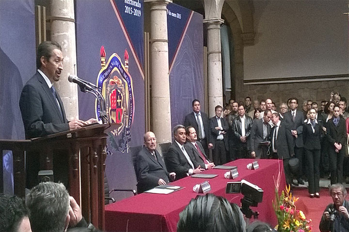 NOTICIAS 09/01/2015Medardo Serna toma protesta como rector de la UMSNHTomó protesta el rector nicolaita Medardo Serna González al filo de las 11 de la mañana con cinco minutos en el Colegio de San Nicolás de Hidalgo para el periodo 2015-2018 con el compromiso de que la Universidad Michoacana sea "el corazón y el cerebro del proceso de regeneración de Michoacán" en tiempos que dijo vive México y la entidad no es ajena al deterioró del tejido social.