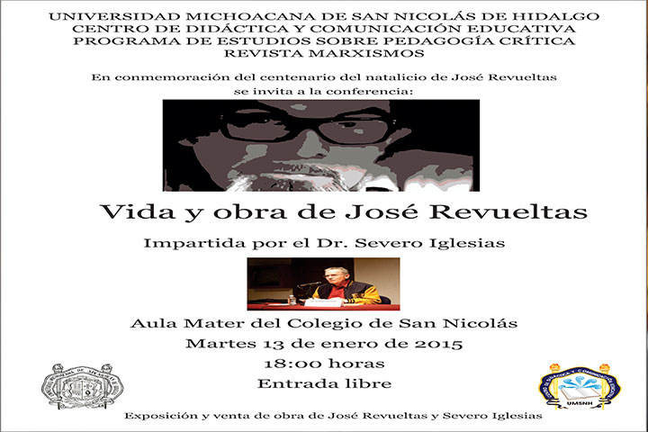 En conmemoración del Centenario del Natalicio de José Revueltas, celebrado el pasado 20 de noviembre del 2014, el Centro de Didáctica y Comunicación Educativa de la Universidad Michoacana de San Nicolás de Hidalgo invita a la comunidad universitaria así como al público en general a la conferencia "Vida y obra de José Revueltas "impartida por el Doctor Severo Iglesias González.
