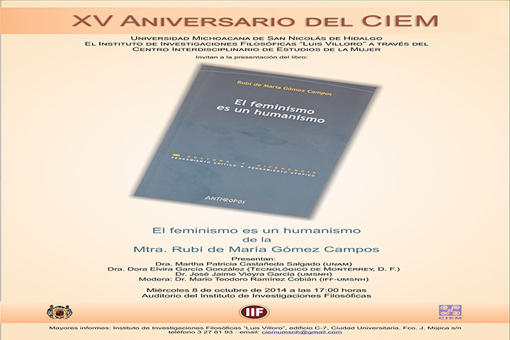 NOTICIAS 07/10/2014Presentarán libro sobre feminismo En el marco de las actividades por el 15 aniversario del Centro Interdisciplinario de Estudios de la Mujer, (CIEM), este miércoles 8 de los corrientes a partir de las 17 horas, se realizará la presentación del libro "El feminismo es un Humanismo", de la profesora e investigadora del Instituto de Investigaciones Filosóficas "Luis Villoro", Rubí de María Gómez Campos.