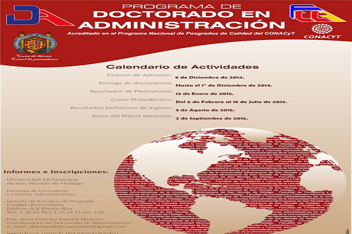 Único en su género en todo México, la Facultad de Contaduría y Ciencias Administrativas de la UMSNH ofrece su programa de Doctorado en Administración orientado a formar investigadores líderes en el campo de la administración y con reconocimiento de las necesidades prioritarias de nuestro país, capaces de aportar conocimientos que permitan contribuir al desarrollo de instituciones competitivas e innovadoras. Este posgrado es internacion... Ver más...