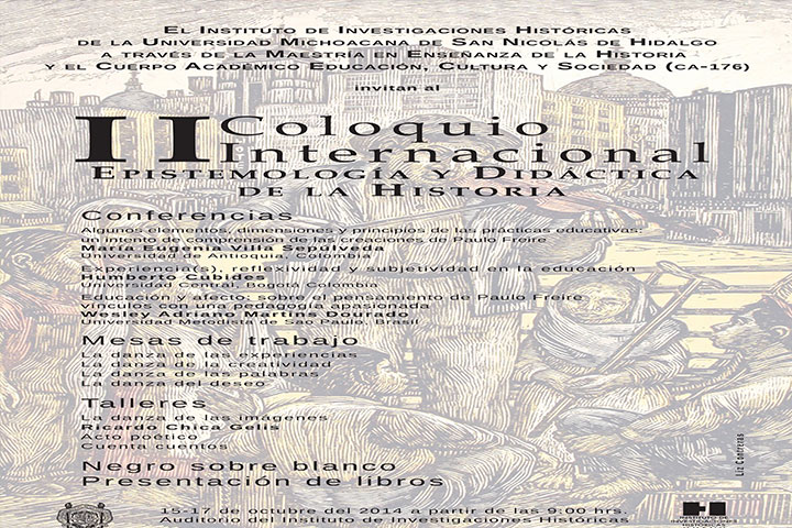 NOTICIAS 11/10/2014Invitan al II Coloquio "Epistemología y Didáctica de la Historia" El Instituto de Investigaciones Históricas de la Universidad Michoacana de San Nicolás de Hidalgo, a través de la maestría en Enseñanza de la Historia y el Cuerpo Académico Educación, Cultura y Sociedad, invitan al II Coloquio Internacional "Epistemología y Didáctica de la Historia".