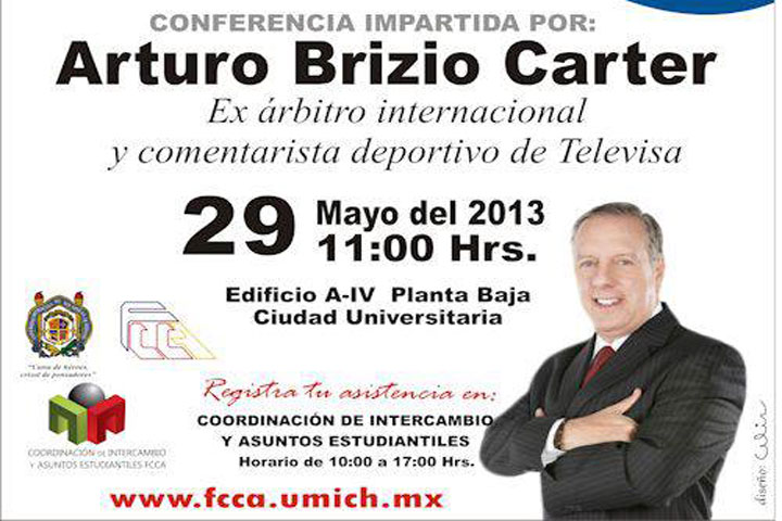 Arturo Brizio Carter, ex árbitro internacional mexicano de fútbol con gafete de la FIFA y comentarista deportivo de Televisa estará mañana en Morelia para impartir la conferencia Decisiones con Valor e interactuar con estudiantes de la Facultad de ContadurÃa y Ciencias Administrativas de la Universidad Michoacana de San Nicolás de Hidalgo.
