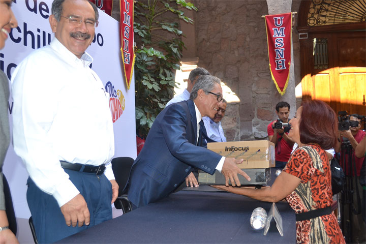 La Universidad Michoacana de San Nicolás de Hidalgo (UMSNH), entregó equipo de cómputo y proyección por un monto de más de 4 millones de pesos, destinado a las 7 preparatorias de la Máxima Casa de Estudios en la Entidad.