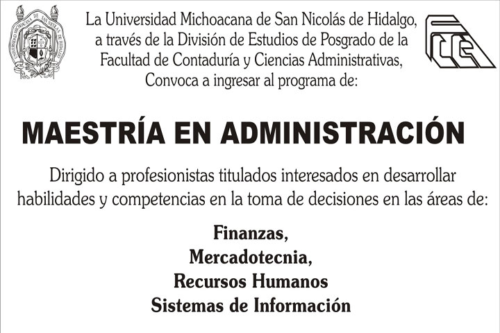 La División de Estudios de Posgrado de la Facultad de Contaduría y Ciencias Administrativas (FCCA) de la Universidad Michoacana de San Nicolás de Hidalgo convoca a ingresar al programa de Maestría en Administración dirigido a profesionistas titulados interesados en desarrollar habilidades y competencias en la toma de decisiones en las áreas de Finanzas, Mercadotecnia, Recursos Humanos y Sistemas de Administración. Los egresados están pr... Ver más...