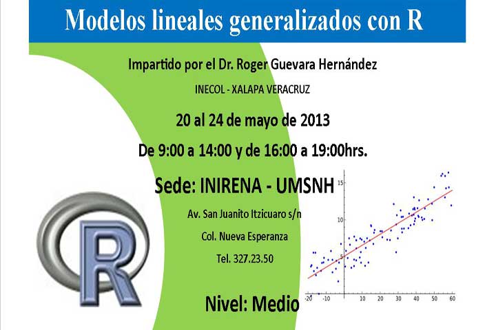 El Instituto de Investigaciones sobre Recursos Naturales (INIRENA) de la Universidad Michoacana de San Nicolás de Hidalgo y la Comisión Mixta General de Capacitación y Adiestramiento UMSNH-SPUM invitan a académicos nicolaitas y externos al curso de estadística sobre Modelos lineales generalizados con R, impartido por el Dr. Roger Guevara Hernández del Instituto de Ecología (INECOL) de Xalapa, Veracruz.
