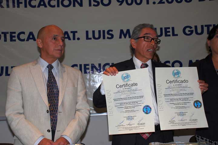 El rector de la Universidad Michoacana de San Nicolás de Hidalgo (UMSNH), Salvador Jara Guerrero entregó el certificado de calidad ISO 9001:2008 a la biblioteca "Luis Manuel Gutiérrez" de la Facultad de Ciencias FÃsico Matemáticas, al director de esta dependencia Rafael González con lo que suman 14 las bibliotecas de esta casa de estudios que han aprobado dicho proceso.