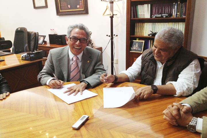 El rector Salvador Jara Guerrero y el dirigente del Sindicato de Empleados (SUEUM), Eduardo Tena, firmaron los acuerdos alcanzados entre las ... Ver más...