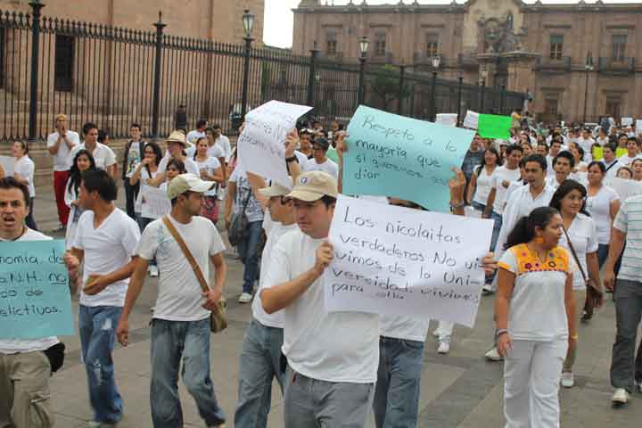 NOTICIAS 17/05/2012Vuelven a marchar alumnos de la UM, buscan audiencia con el gobernadorDe nueva cuenta estudiantes de la Universidad Michoacana salieron a las calles para exigir sean liberadas las instalaciones de la universidad Michoacana. Al igual que el día de ayer, el grupo de jóvenes nicolaitas inicio la movilización desde la Plaza Morelos para llegar a Catedral donde en estos momentos se encuentran.