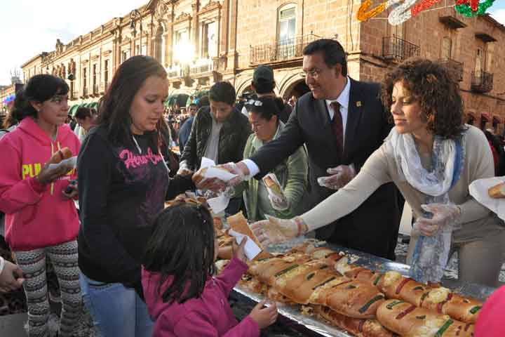 El Ayuntamiento de Morelia cerró la celebración del Día de Reyes con la tradicional Rosca. Miles de morelianos acudieron un año más a la invitación del alcalde y la presidenta del DIF Morelia, Maggy Oribio de Lázaro para compartir este tradicional pan que este año fue de dos kilómetros de longitud.