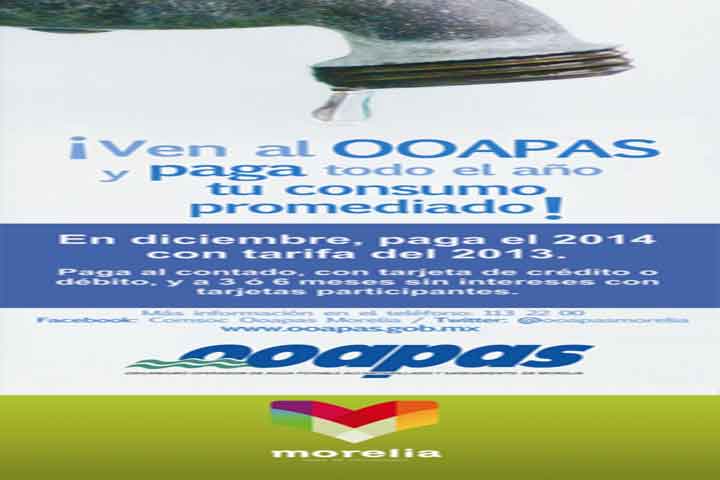 El Organismo Operador de Agua Potable, Alcantarillado y Saneamiento de Morelia (OOAPAS) inicia en el mes de diciembre su ya tradicional Programa de Pago Anticipado, donde los usuarios podrán pagar el 2014 basándose en el promedio de sus consumos de agua del 2013, con las tarifas vigentes.