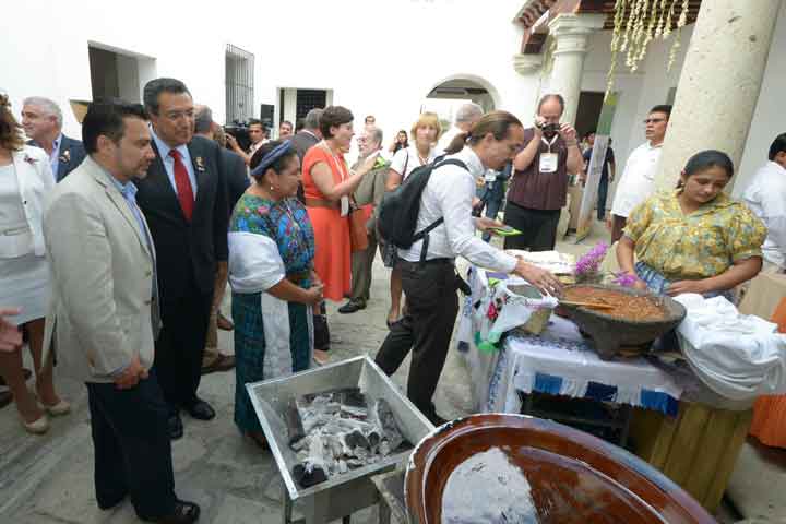 La Casa Morelos ubicada en el centro histórico de la capital oaxaqueña fue escenario perfecto para que 70 alcaldes de los cinco continentes del mundo, quienes participan en el Congreso Mundial de Ciudades Patrimonio, pudieran disfrutar de la gastronomía michoacana, distinguida por la UNESCO como Patrimonio Intangible de la Humanidad.