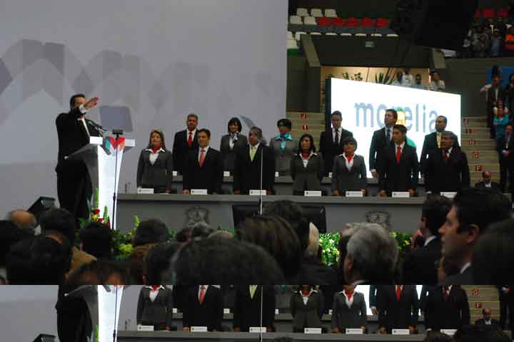 En un auditorio prácticamente lleno, Wilfrido Lázaro Medina, tomo protesta como presidente municipal de Morelia, ante la presencia del Gobernador del Estado, Fausto Vallejo Figueroa; el presidente de la Mesa Directiva del Congreso, Víctor Silva; el presidente del Supremo Tribunal de Justica del Estado, Alejandro González.