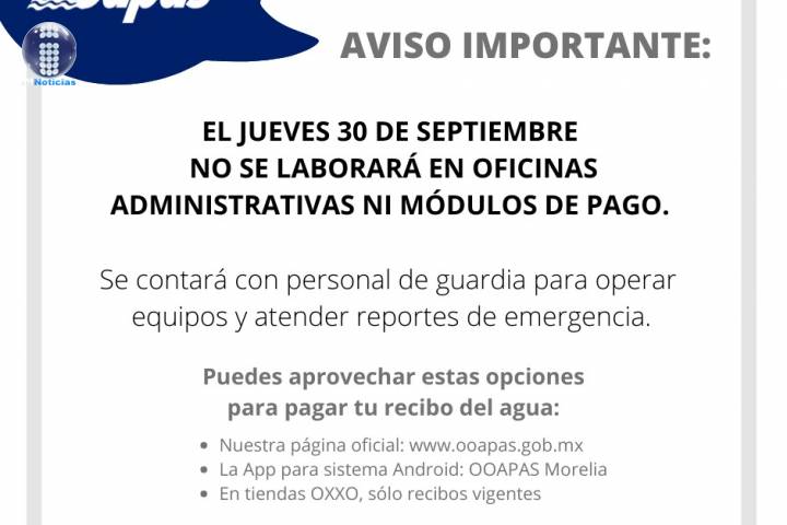 NOTICIAS 28/09/2021Aviso OOAPAS por día inhábil el 30 de septiembre El Organismo Operador de Agua Potable, Alcantarillado y Saneamiento de Morelia (OOAPAS) informa que de acuerdo con el calendario oficial, el próximo jueves 30 de septiembre será día inhábil, por lo que no se laborará en oficinas administrativas ni módulos de pago de la paramunicipal.